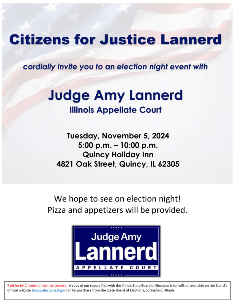 Citizens for Justice Lannerdcordially invite you to an election night event with Judge Amy Lannerd Illinois Appellate Court Tuesday, November 5, 2024 5:00 p.m. – 10:00 p.m. Quincy Holiday Inn 4821 Oak Street, Quincy, IL 62305