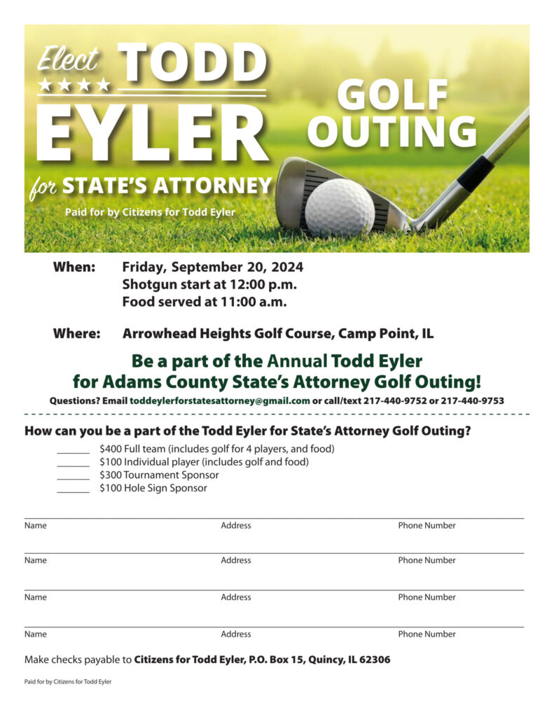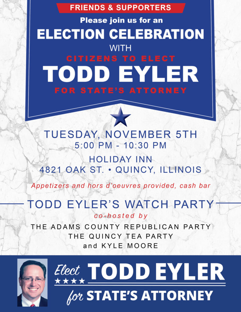 FRIENDS & SUPPORTERSPlease join us for anELECTION CELEBRATION WITH CITIZENS TO ELECT TODD EYLER FOR STATE’S ATTORNEY TUESDAY, NOVEMBER 5TH5:00 PM – 10:30 PMHOLIDAY INN4821 OAK ST. • QUINCY, ILLINOISAppetizers and hors d’oeuvres provided, cash barTODD EYLER’S WATCH PARTYco-hosted byTHE ADAMS COUNTY REPUBLICAN PARTYTHE QUINCY TEA PARTYand KYLE MOORE