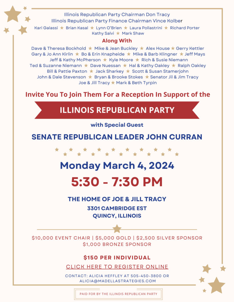 Monday March 4, 20245:30 – 7:30 PMTHE HOME OF JOE & JILL TRACY3301 CAMBRIDGE ESTQUINCY, ILLINOISInvite You To Join Them For a Reception In Support of theIllinois Republican Party Chairman Don TracyIllinois Republican Party Finance Chairman Vince Kolber