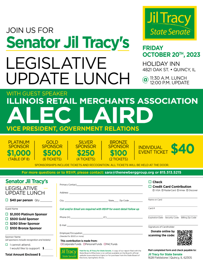 Please mark your calendar for Senator Jil Tracy’s Legislative Lunch at The Holiday Inn in Quincy, Friday, October 20th at 11:30am. A copy of the invitation is attached below. You may register by mailing back the response form, contacting sara@thenewberggroup.org, or by calling 815.513.5215. We look forward to seeing you at this great event! Thank … Read more