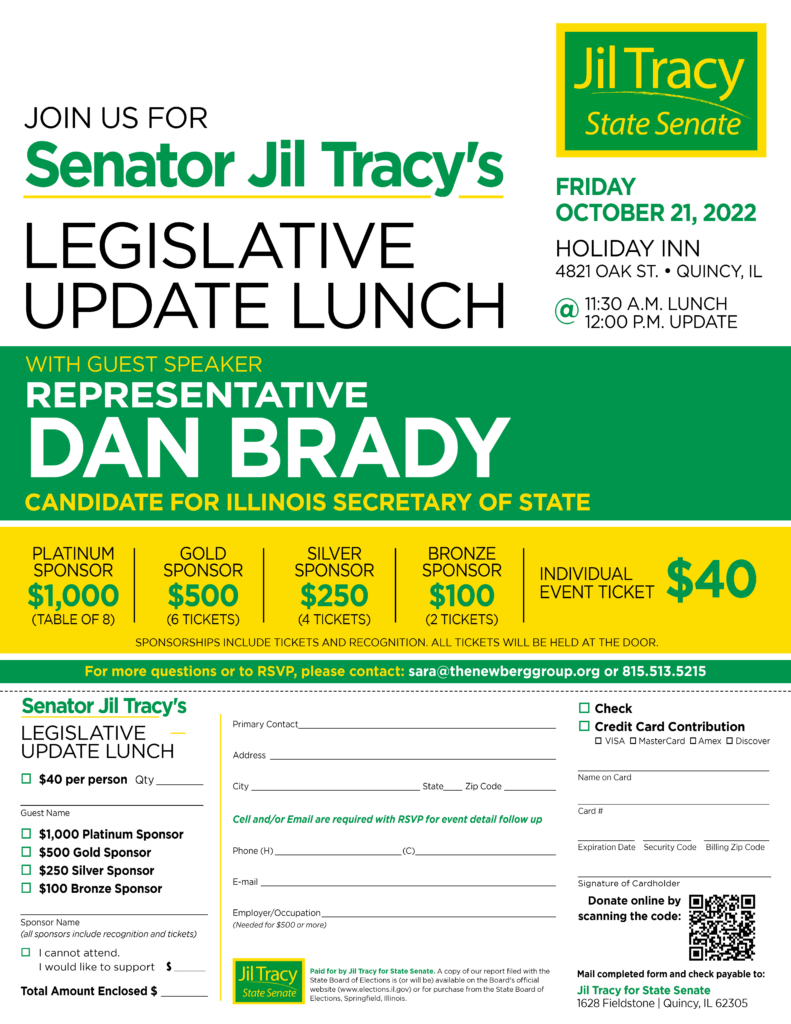 This is a quick reminder for Senator Jil Tracy’s Annual Legislative Luncheon Friday October 21, 2022 at 11:30am!Holiday Inn4821 Oak St, Quincy, IL We do request that you RSVP ahead of time. You may do so by contacting sara@thenewberggroup.org, or by calling 815.513.5215.